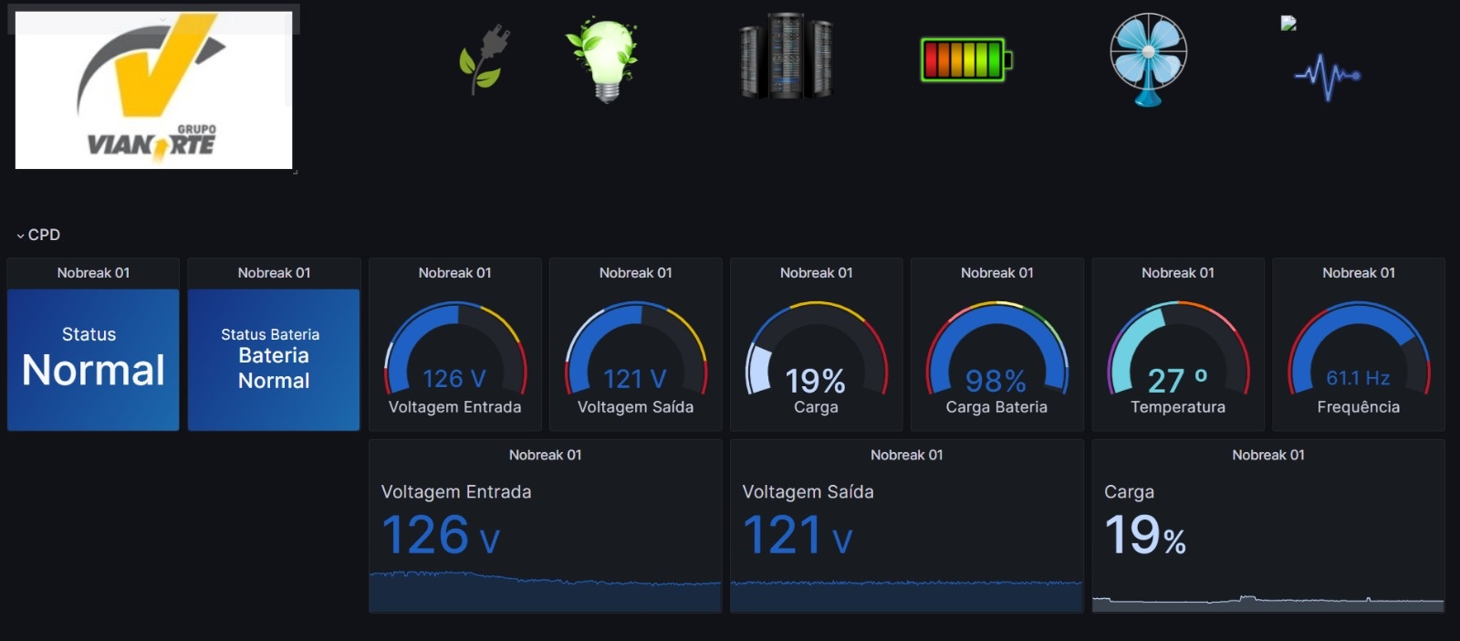 - Alerta tensão de entrada, tensão de saída, temperatura do nobreak, consumo de carga, frequência, status on-line / Bypass, data de troca do banco de baterias, falta de energia;